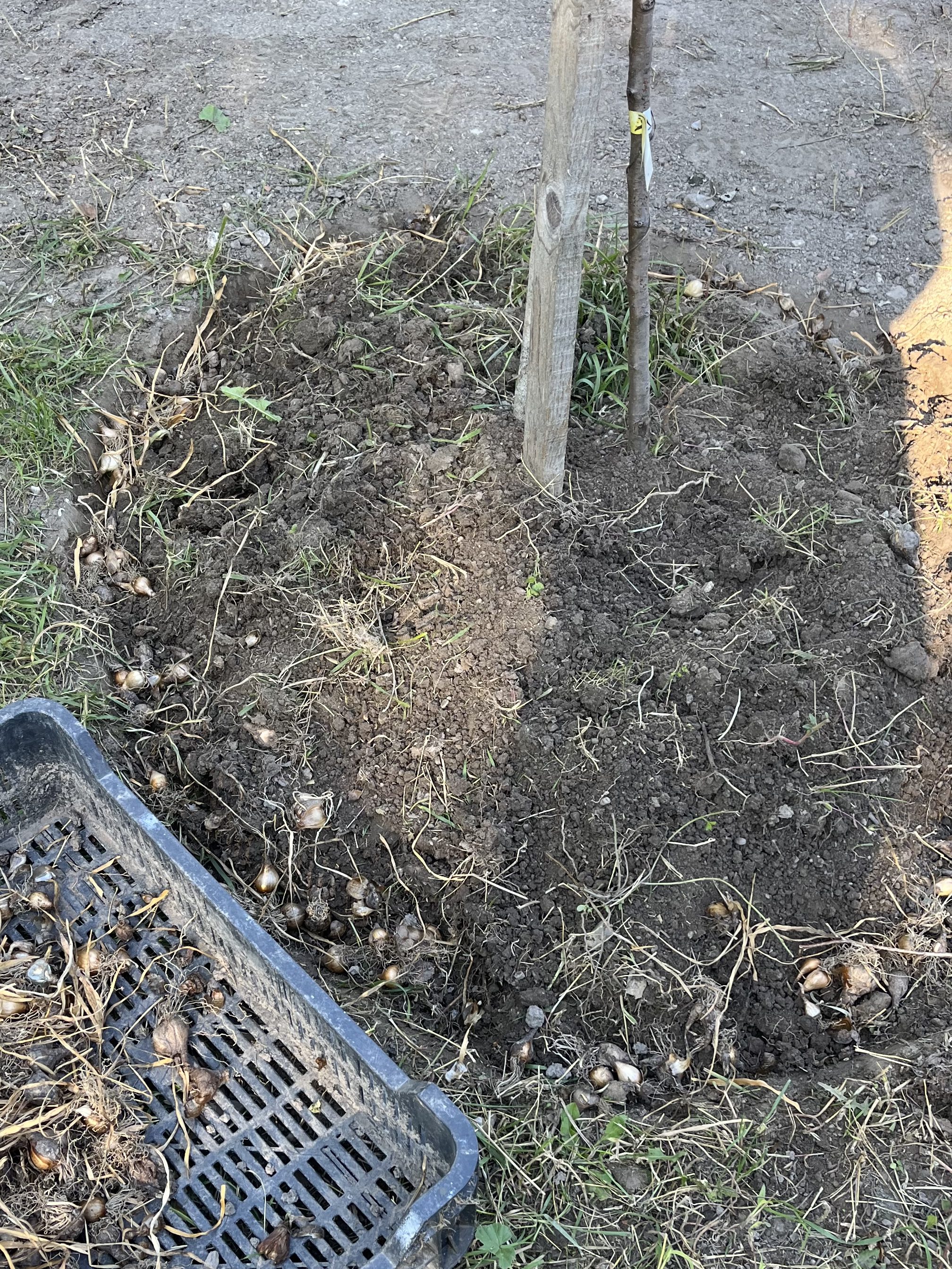 A gyümölcsfáim tövében először fellazítottam a talajt, eltávolítottam a gyomokat, majd két körben eldugtam a hagymákat. Ezután a lombkorona ledarálásából származó leveles- fás mulcsot 10-15 cm vastagságba terítettem föléjük.